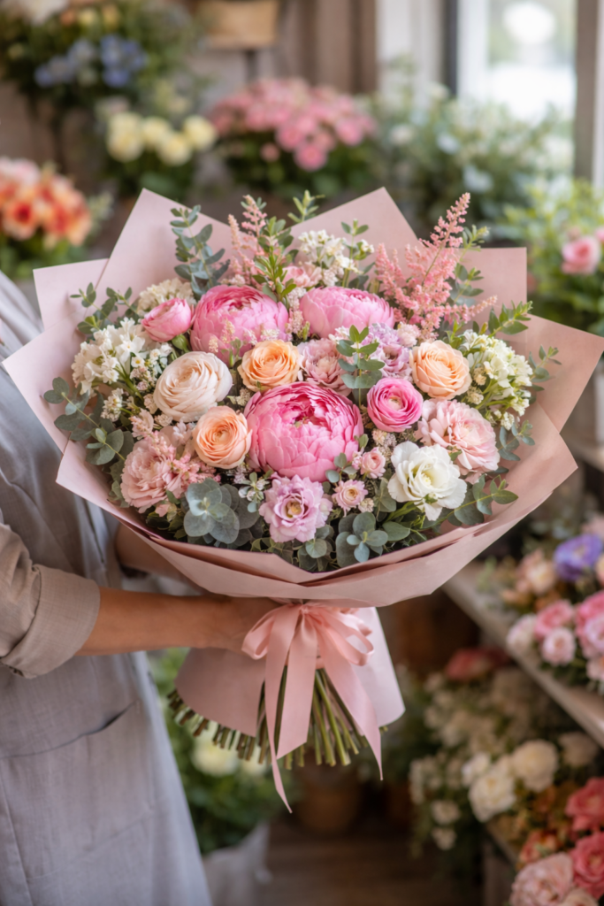 Trabajamos de forma cercana y personalizada, creando ramos artesanales, composiciones florales exclusivas y arreglos a medida, adaptados a cada persona y ocasión.